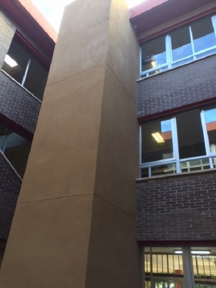 La solución obtenida para la instalación del equipo elevador es la implantación de una estructura metálica para soportar el equipo elevador, con su correspondiente cerramiento de ladrillo cerámico y teniendo como capas de terminación un enlucido y posterior pintado. Se ha tenido que readaptar todas las plantas para tener acceso a dicho elevador. Finalmente, en la cubierta de la estructura metálica se ha impermeabilizado y adaptado para que evacúe el agua y no tener problemas de humedad o filtraciones. Consiguiendo así que el colegio se adapte a la normativa de accesibilidad para gente con movilidad reducida.